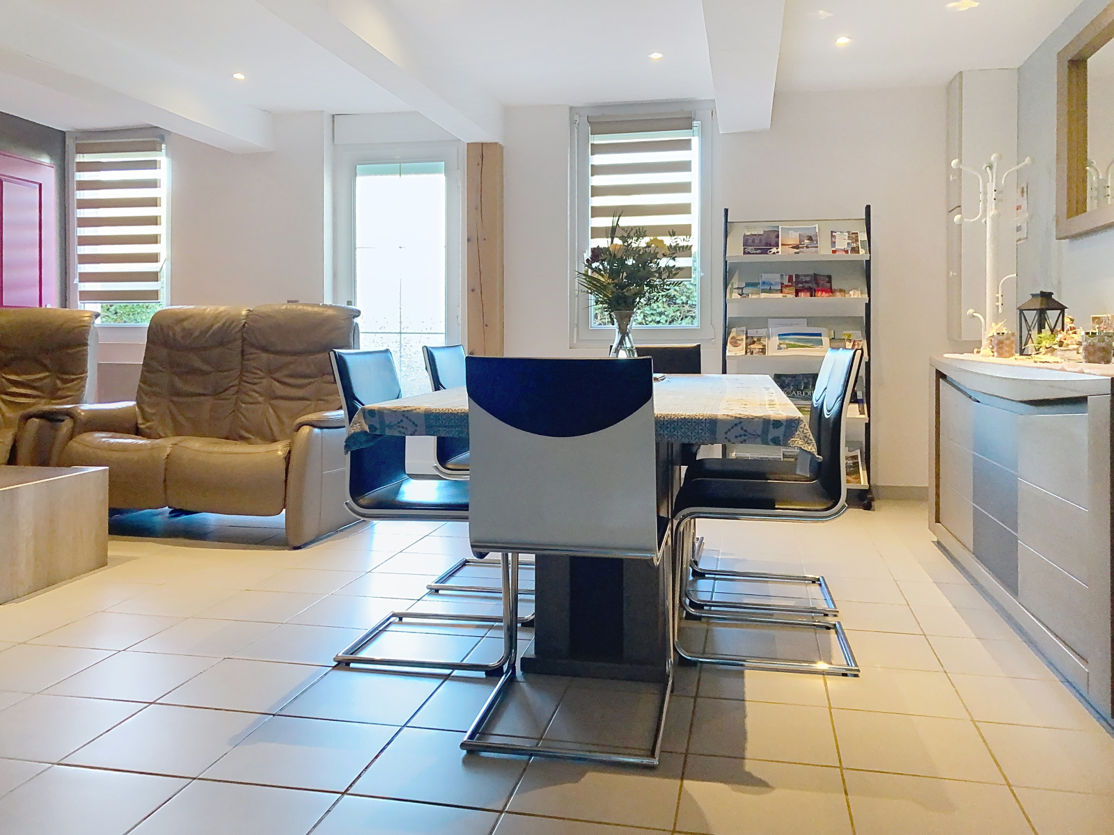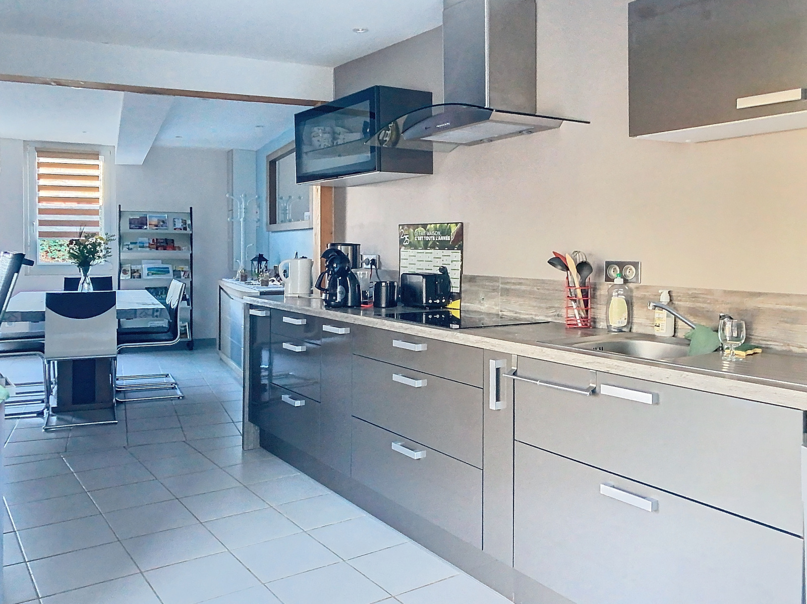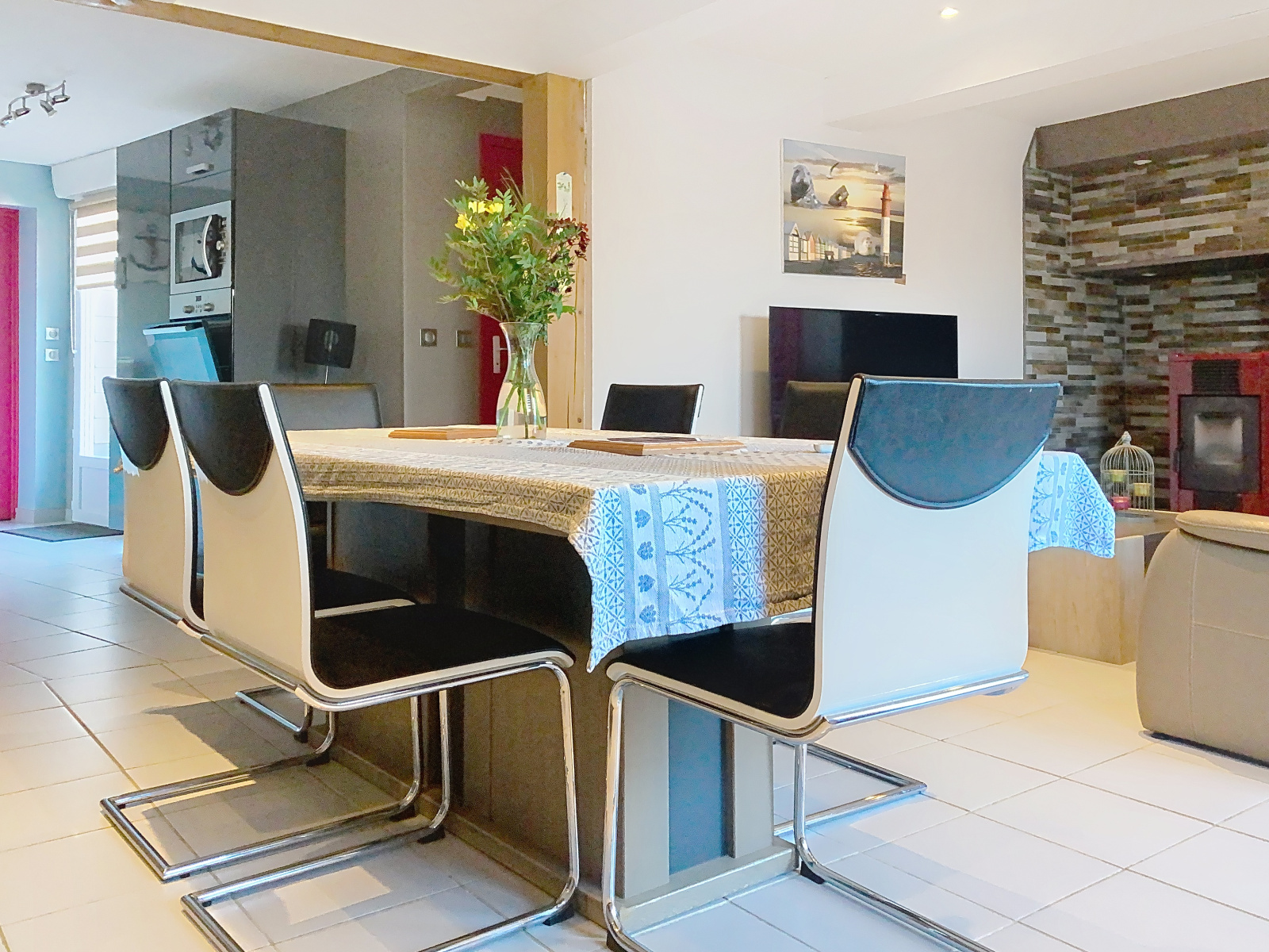 Au rez-de-chaussée, un vaste séjour très chaleureux avec son poêle à granulés, une cuisine ouverte aménagée et équipée, une salle d'eau, un WC, et une chambre avec dressing